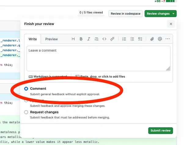 - If line comments are just for clarification or discussion, choose “Comment” instead of “Request changes”:
